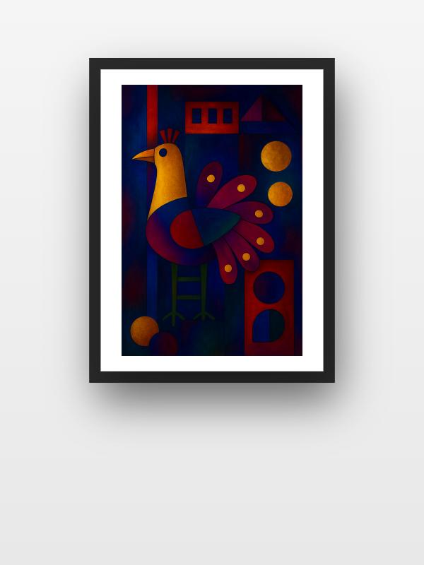 A bold bird rises from the darkness, its body cut from slabs of deep blue, blazing red, and molten gold. Geometric shapes slice through the scene, charging the air with restless energy. The colors clash and glow, jolting your senses awake and pulling you closer. This artwork radiates heat and confidence, daring you to look away.