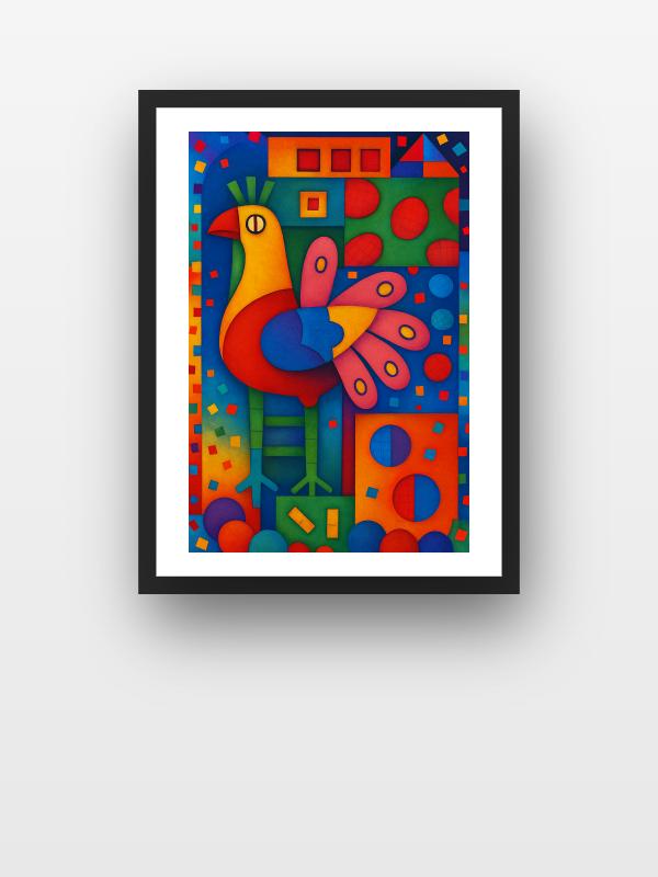 A fierce, geometric bird rises from a storm of color, its body built from slabs of red, blue, and yellow that demand attention. Electric pink and gold feathers explode outward, edged with razor-sharp lines that cut through the chaos. The background thrums with clashing squares and circles, each shape alive with restless energy. This artwork hits you with a shock of joy, daring you to wake up and feel every color.