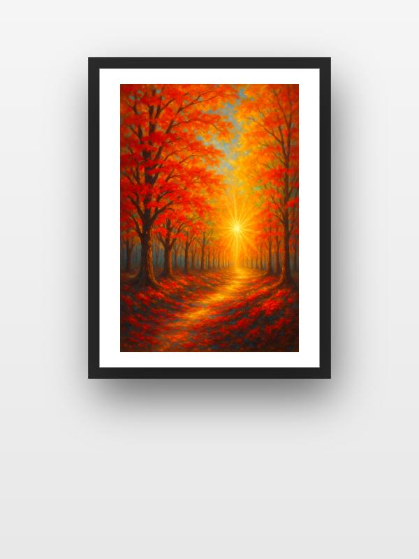 A tunnel of blazing autumn trees explodes with reds and oranges, pulling you down a sunlit path that feels alive with heat. Golden light rips through the branches, setting every leaf on fire and turning the ground into a molten river. Deep shadows carve out the scene, anchoring the wild color with earthy force. The whole image surges with hope and restless energy, as if the world is burning forward.