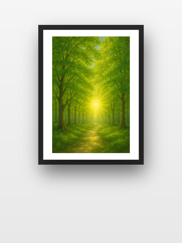 Sunlight blasts through a tunnel of towering green trees, setting the forest on fire with a fierce, golden blaze. The path slices forward, dragging your eyes and your hopes into the heart of the glowing woods. Vivid greens and electric yellows collide and surge, flooding the scene with raw, pulsing energy. This light doesn’t just warm—it jolts you awake, filling your chest with hunger for what’s next.