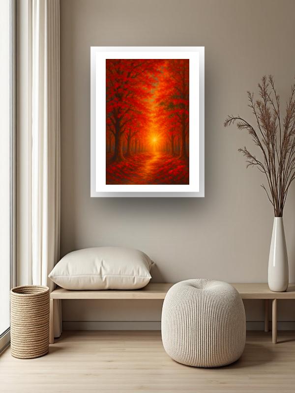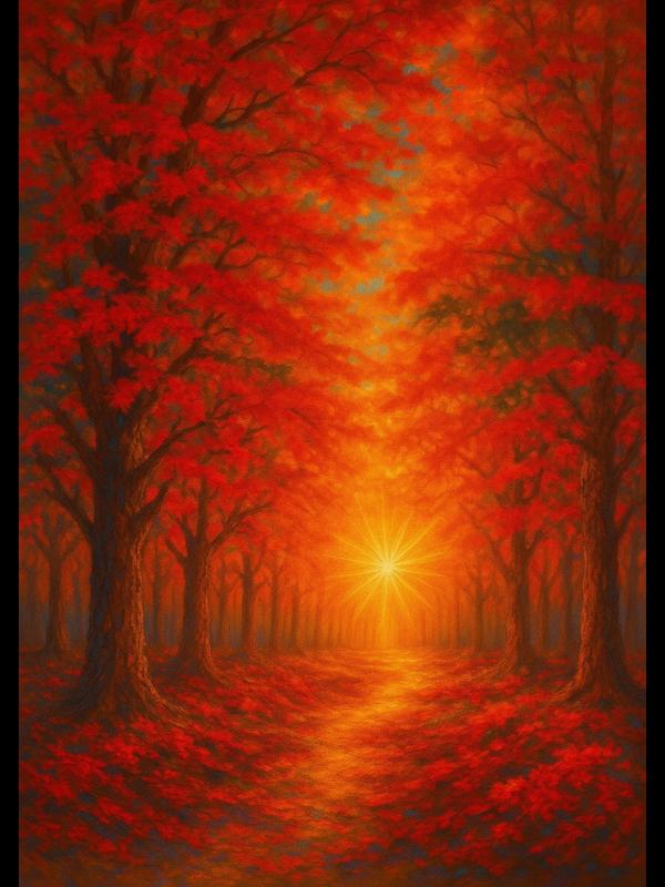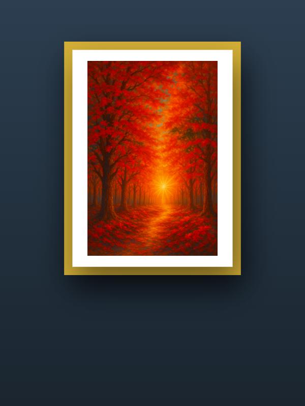 A tunnel of blazing red trees pulls you down a glowing path, straight into the heart of a burning sun. Fiery oranges and deep crimsons crash together, flooding the forest with heat and restless energy. The light doesn’t just shine—it roars, igniting every leaf and shadow with raw, electric life. You feel the rush of autumn’s fire, urgent and unstoppable, daring you to step forward.
