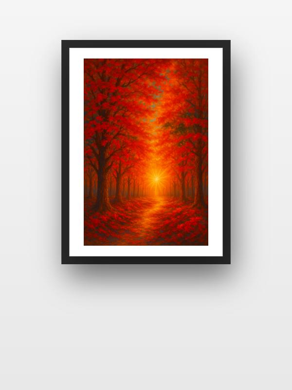 A tunnel of blazing red trees pulls you down a glowing path, straight into the heart of a golden sunburst. Leaves burn with fierce orange and crimson, igniting the forest floor and sky in a riot of heat. The light doesn’t just shine—it roars, flooding everything with a wild, unstoppable energy. Standing here, you feel the rush of autumn’s fire and the promise of something bold just beyond the horizon.