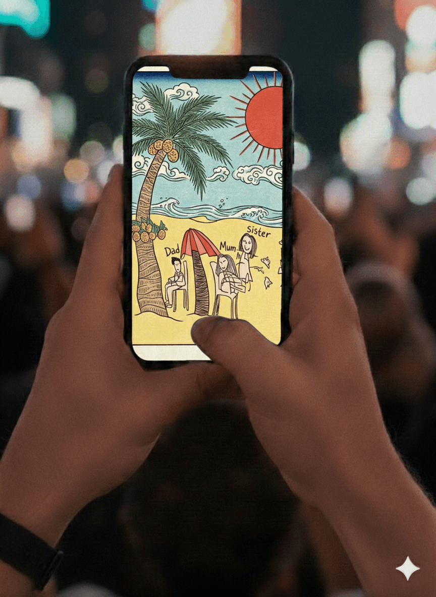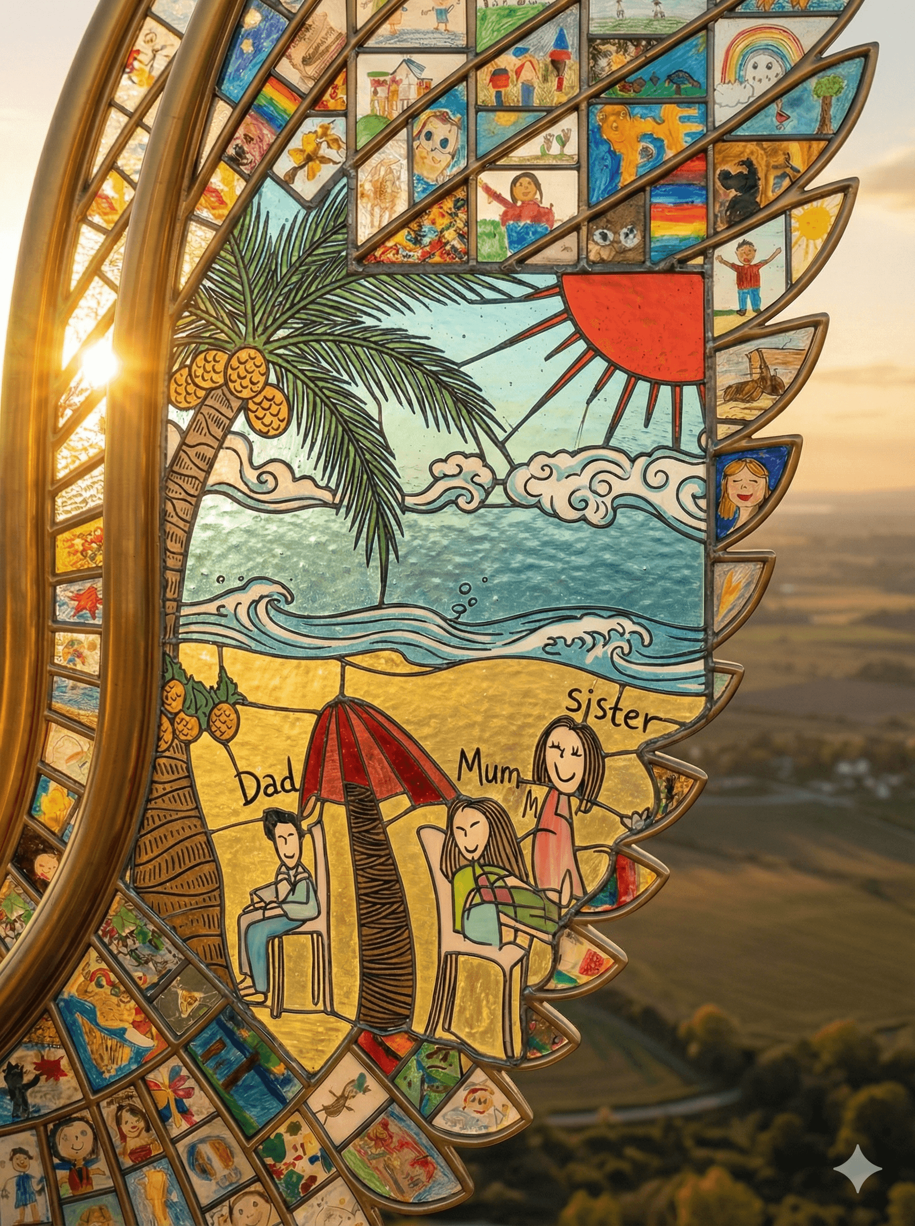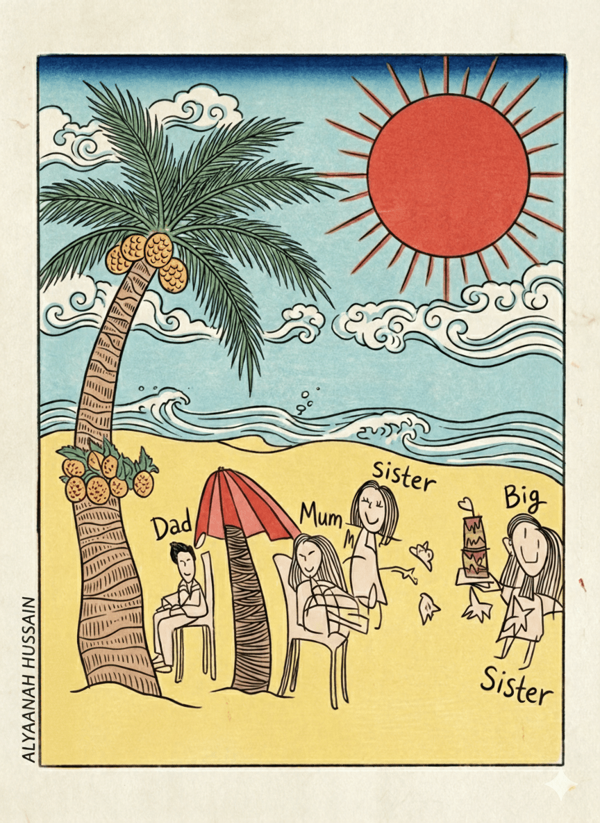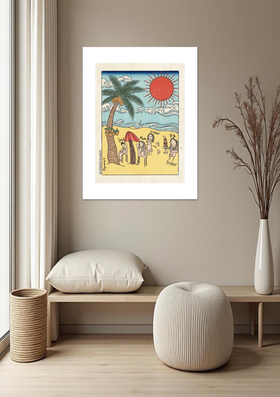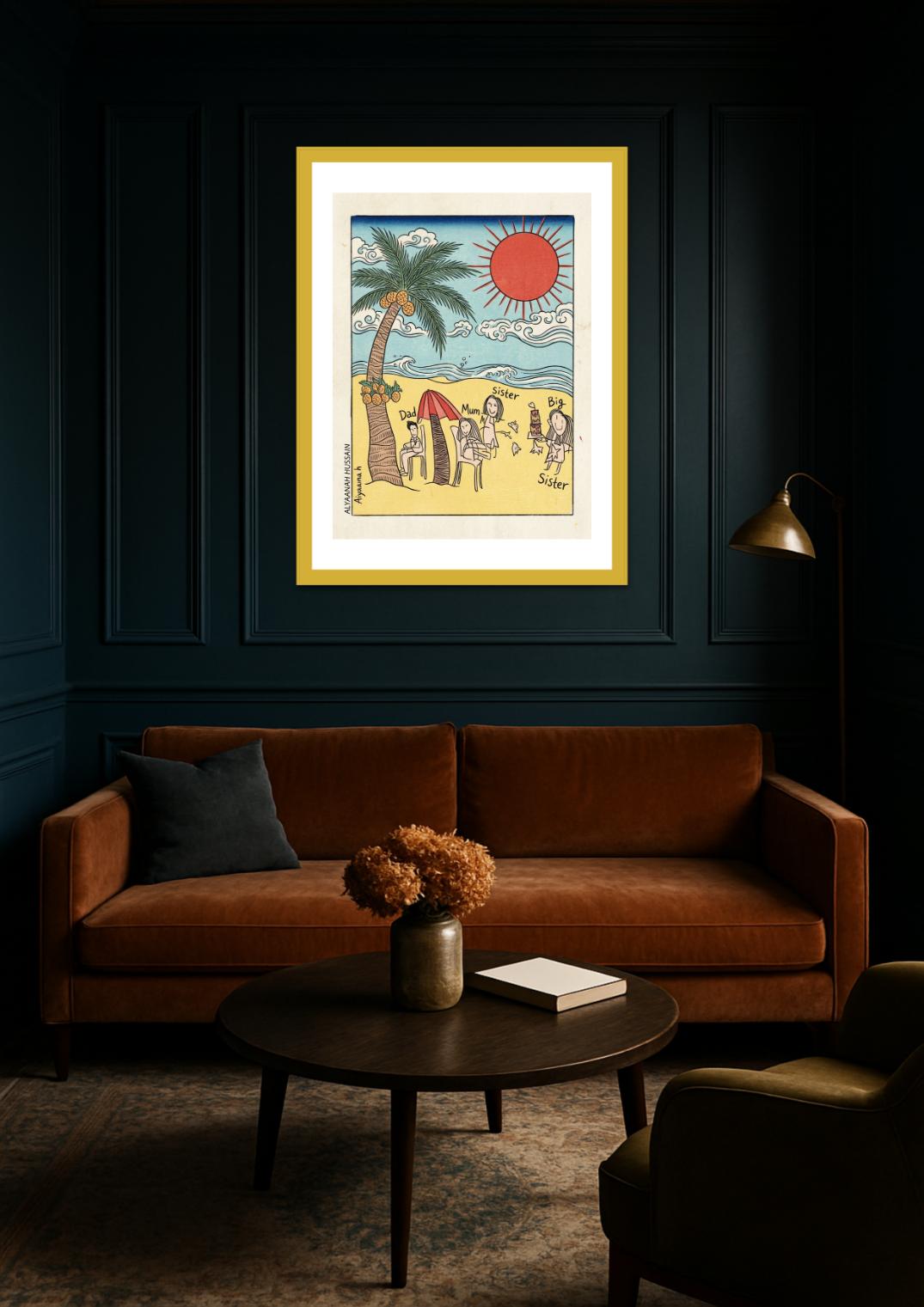 A beach family line-up under a sun says holiday calm, but it’s really about belonging. Red sun, blue sea, yellow sand and hard edges make a warm roll-call, everyone counted.