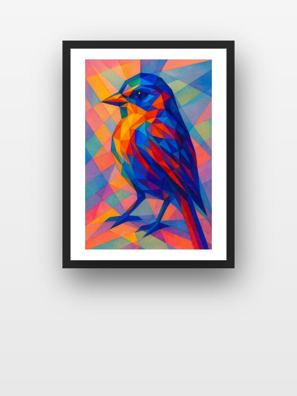 A bird explodes from a storm of electric blue, orange, and red, its body cut from jagged shards that crackle with energy. Each feather slices through a rush of color, catching the light like stained glass and throwing it back in your face. The bird’s fierce eye dares you to look away, alive with intent. These colors don’t whisper—they surge, flooding you with a raw hit of hope and restless drive.