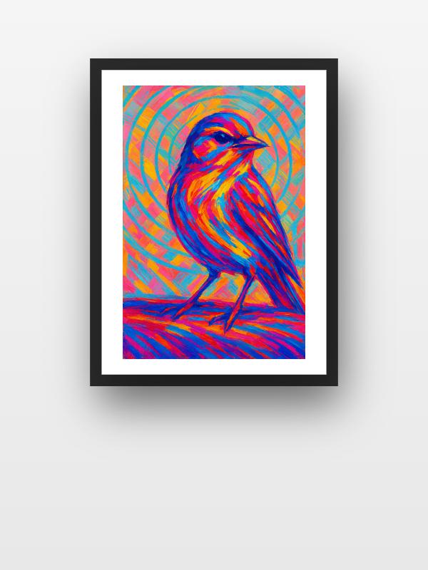 A bird explodes from the canvas, its feathers ripped with cobalt, magenta, and gold that burn against the eye. Vivid rings throb behind it, pushing the whole scene into motion and refusing to let you look away. The colors collide and spark, sending a jolt of heat and adrenaline through your chest. This painting doesn’t just show a bird—it dares you to feel alive.