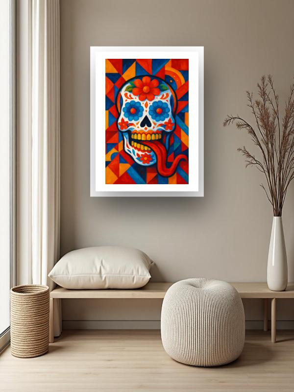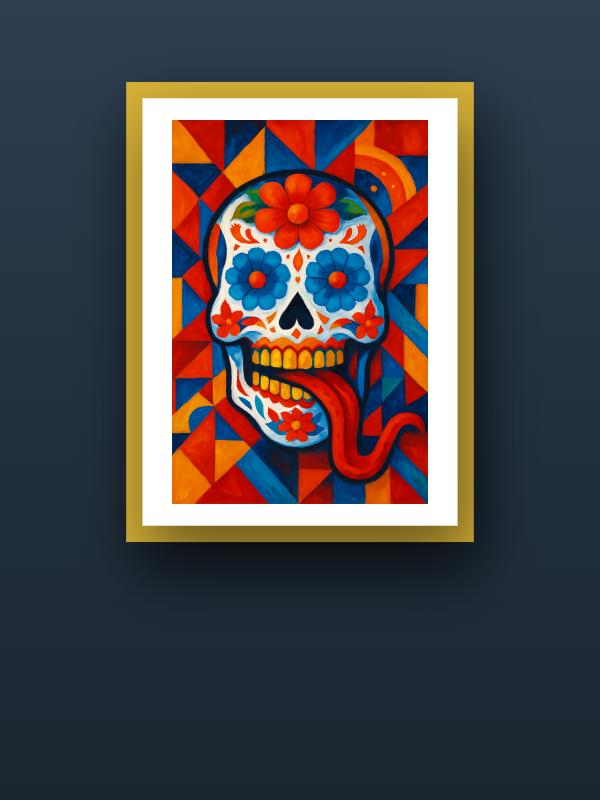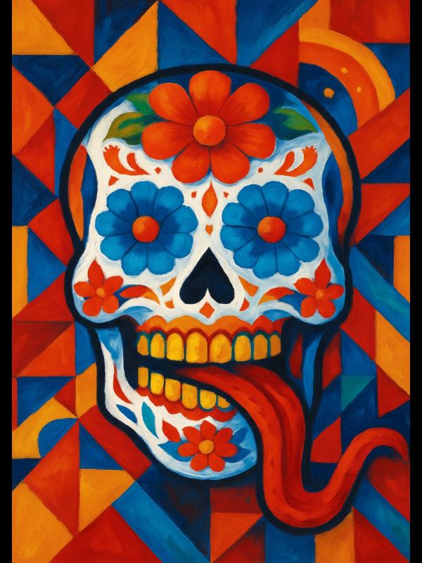A skull lunges out, its eye sockets blazing with blue flowers and a red tongue snapping defiantly from its mouth. Jagged shapes in orange, blue, and yellow crash together, sparking a wild, electric energy. The colors don’t just sit—they punch, flooding your senses with heat and noise. This piece dares you to meet its stare and feel your pulse race.