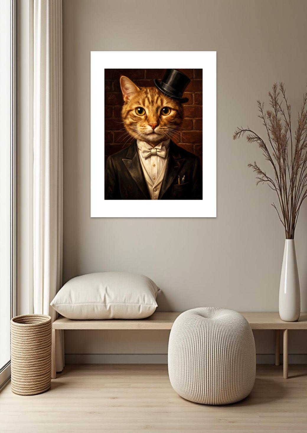 A tuxedo cat in a top hat looks fancy, but it’s pure mischief. Black, gold, and cream plus hard edges hint: play nice, stay wild.