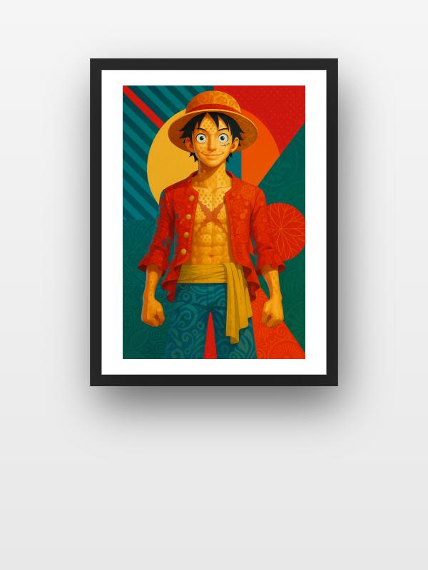 A wide-eyed figure stands unbreakable, chest bare and streaked with gold that seems to pulse with life. Fierce reds and deep teals collide behind him, slicing the air with sharp shapes and bursts of sunlight. His yellow sash and hat blaze against his skin, throwing off a heat that dares you to move. The whole scene surges with courage and raw optimism, pushing you to step up and seize what’s ahead.