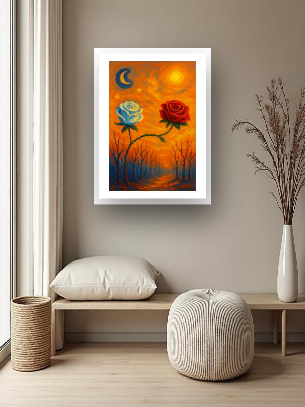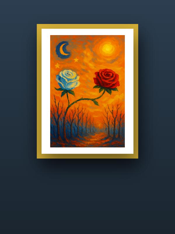 Two roses—one icy blue, one burning red—collide above a forest of stark, leafless trees. The sky splits in orange and gold, torn between a blazing sun and a stubborn crescent moon. Thick, swirling brushstrokes send color and energy crashing through the scene. The clash of heat and chill leaves you caught between longing and fierce hope.