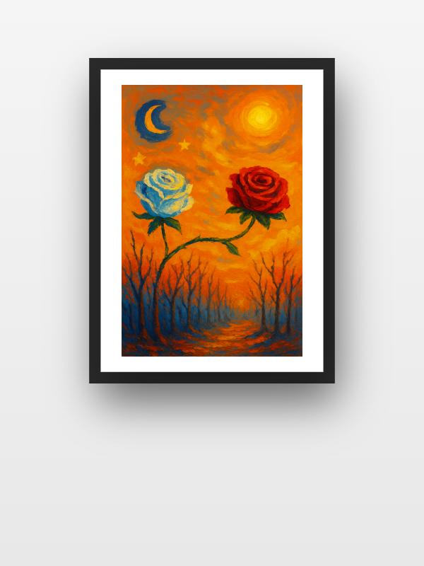 Two roses—one icy blue, one burning red—rise defiantly from a tangled forest of bare, reaching trees. The sky blazes with molten orange, split by a golden sun and a deep blue crescent moon, locking day and night in a silent standoff. Thick, swirling brushstrokes charge the scene with restless energy, making the colors pulse and clash. The heat of the background presses in, but the cool blue and fierce red flowers refuse to yield, sparking a jolt of tension and hope in the viewer.