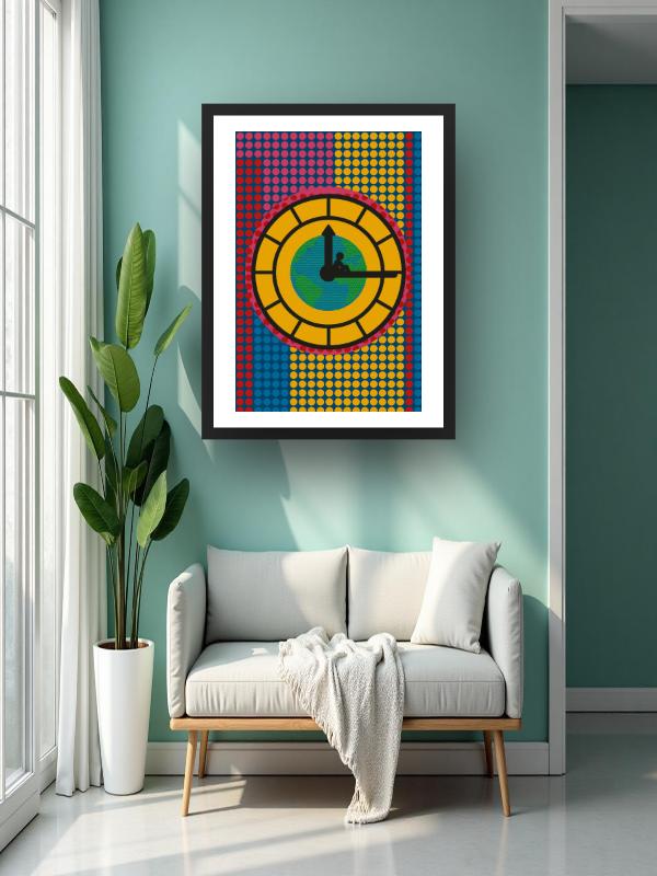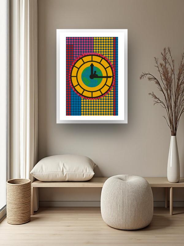 A solitary figure balances on the hand of a giant clock, teetering above a globe that pops with comic-book reds, yellows, and blues. Dots crackle across the surface, charging the scene with frantic, electric energy. Black lines slice through the chaos, trapping the moment in a vise of urgency and tension. The colors hit hard, making you feel the rush and pressure of time slipping away.