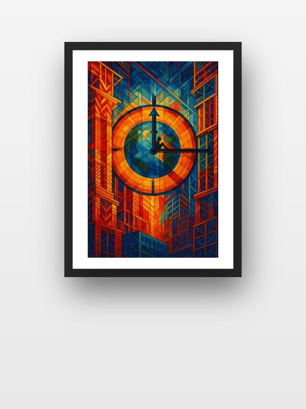 A solitary figure balances on the hand of a massive clock, dwarfed by a city of jagged, geometric towers. Blazing orange light slams against deep blue shadows, charging the scene with raw tension and urgency. The clock’s face burns like a furnace, while icy darkness presses in from every side. This image hits hard, making you feel the electric pressure of time closing in.