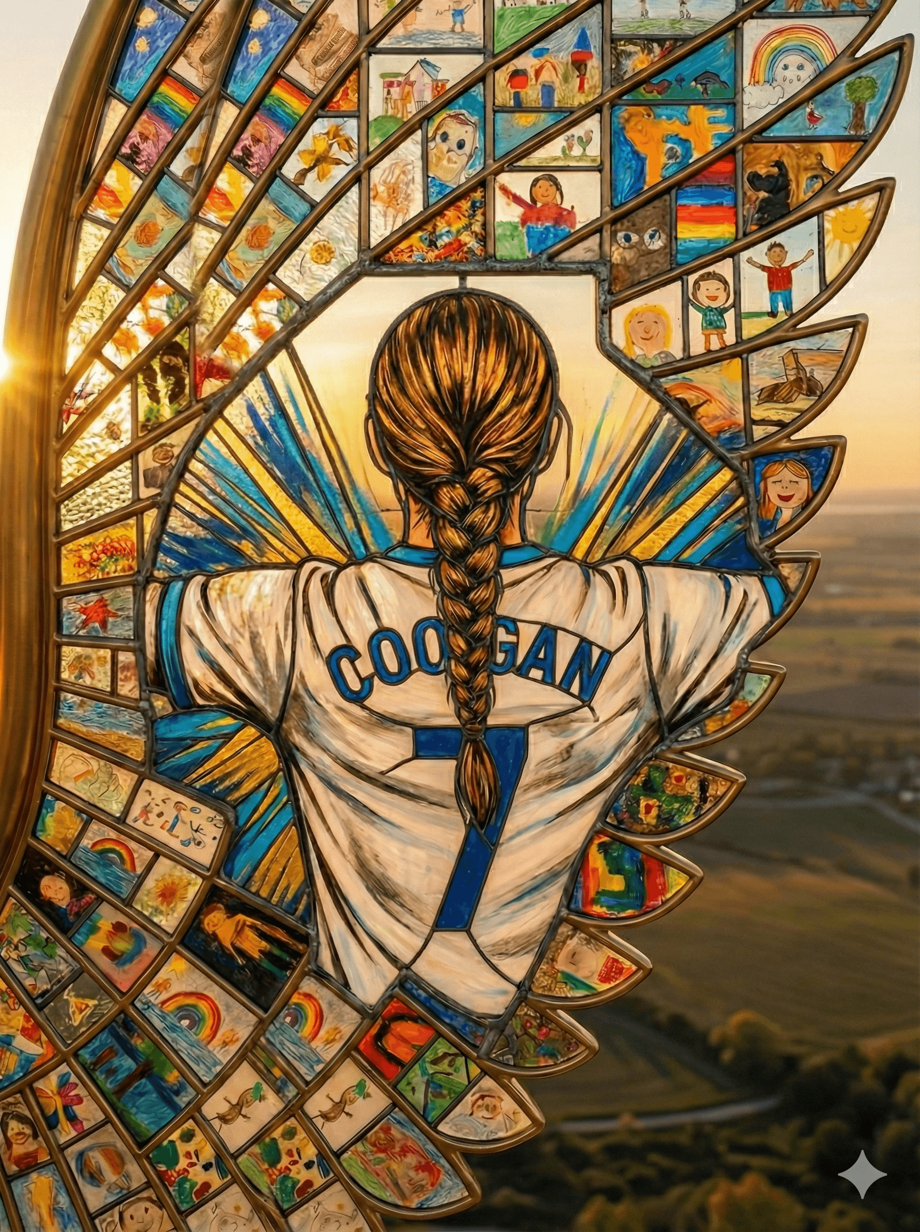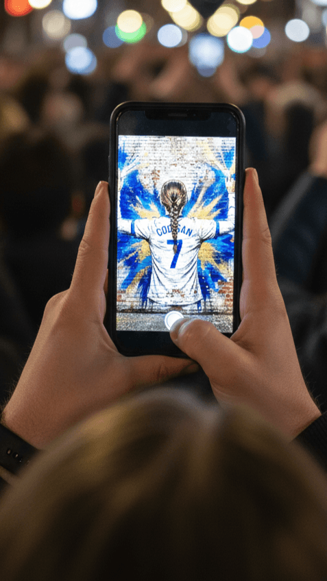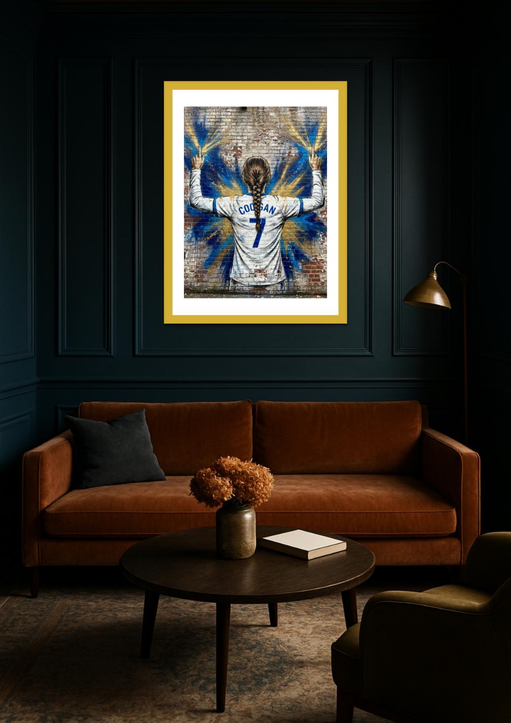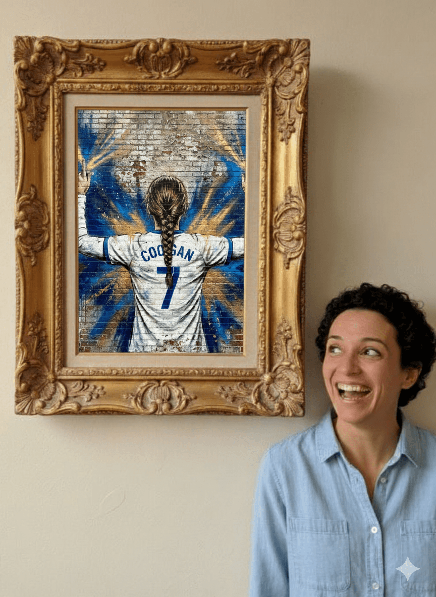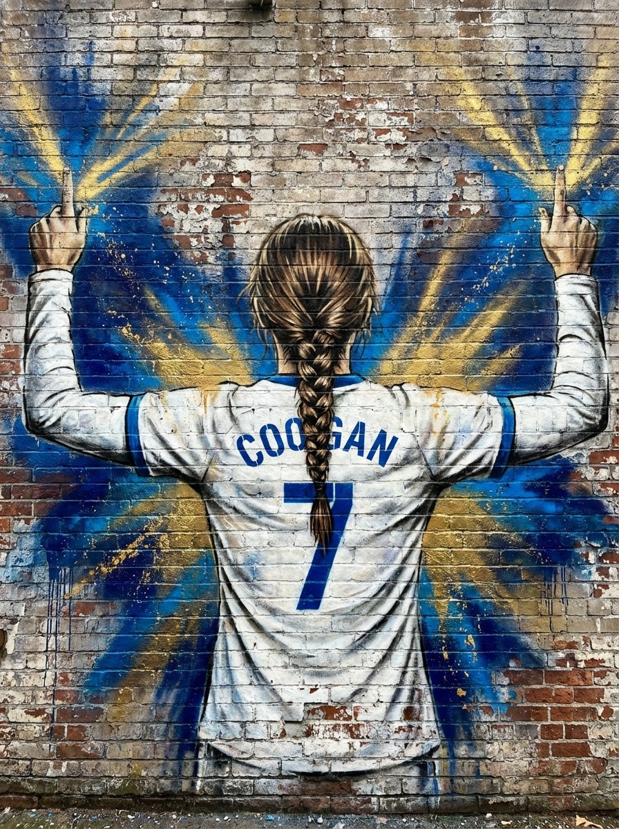 A footballer in a “COOGAN 7” shirt flashes two fingers, but it’s also a love shout. Blue, yellow, and white in scratchy sprays hit the wall—like a chant that sticks.