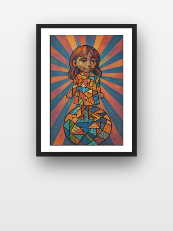 A young girl stands tall on a fractured, patterned world, her body split into sharp shards of orange, blue, and yellow. Sunburst rays explode behind her, flooding the scene with raw heat and restless energy. The electric colors clash and collide, jolting the eye and charging the air with tension and hope. This artwork dares you to feel the courage and weight of standing alone.