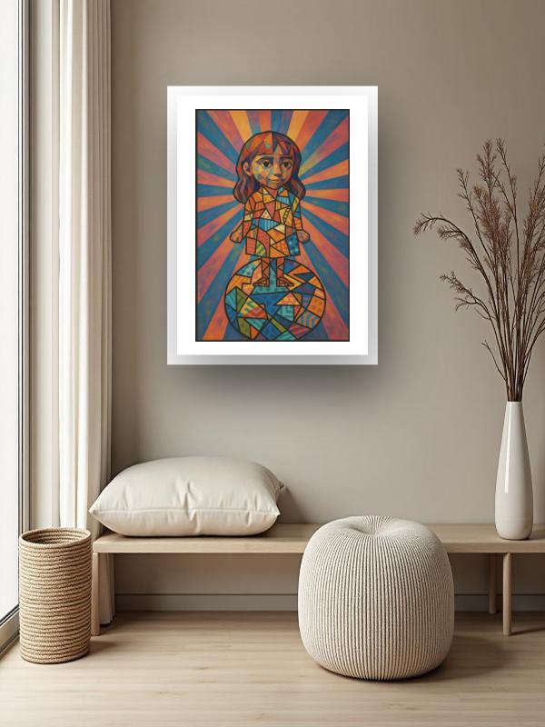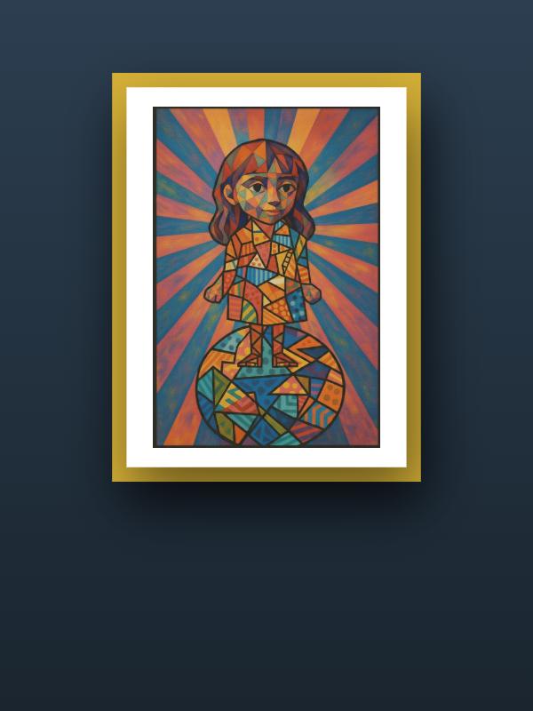 A young girl stands on her own little world. Her whole body is made of bright, colourful shapes that look like pieces of a puzzle. Behind her, big beams of orange and blue shoot outward like a sunrise. She looks calm and steady, like she’s ready to take on whatever comes next.