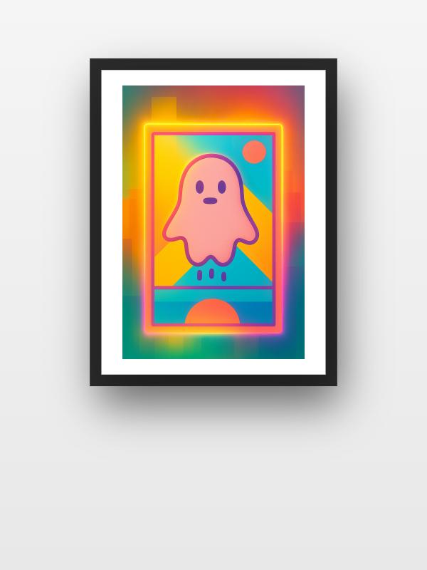 A pink ghost hovers in the center, outlined in thick purple and surrounded by a blast of neon yellow, orange, and turquoise. Geometric shapes and a glowing sun crackle behind it, throwing off sparks of electric energy. Every color leaps forward, hot and bright, demanding your attention. The scene hits you with playful tension and leaves a jolt of curiosity buzzing in your chest.