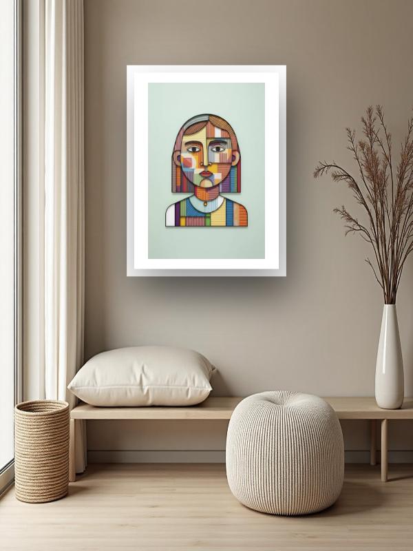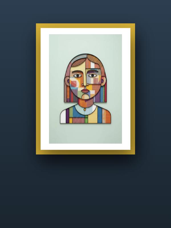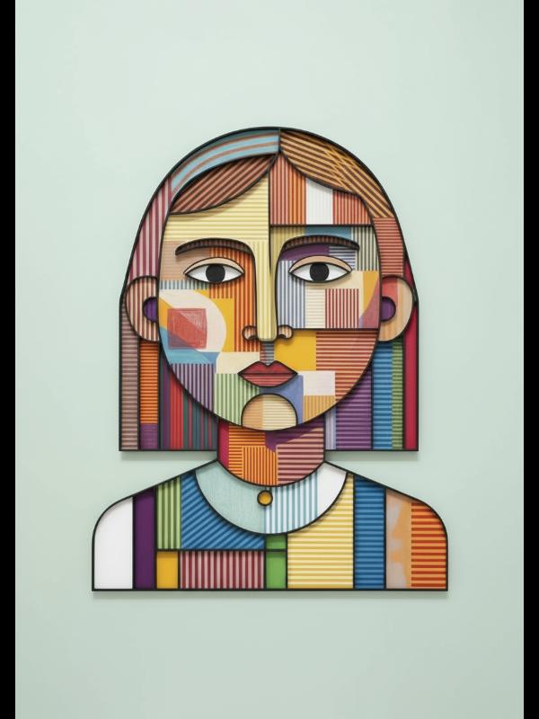 A young face cuts through the noise, built from fierce stripes and blocks of color that clash without apology. Electric reds, deep blues, and sunlit yellows slam together, each fighting for space and refusing to fade. The eyes lock on, wide and unwavering, holding steady in the middle of the storm. This portrait doesn’t ask for attention—it seizes it, making you feel every jolt and jangle in its vivid, restless skin.