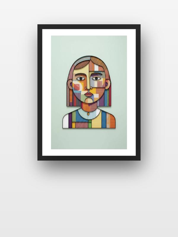 A young woman’s face emerges from jagged stripes and blocks of color, each section refusing to blend or back down. Electric reds, deep blues, and sunlit yellows crash together, charging the portrait with restless energy. Her wide, unblinking eyes cut through the chaos, steady and haunting. The fractured colors pull you in, sparking curiosity and a raw urge to look closer.