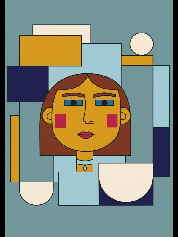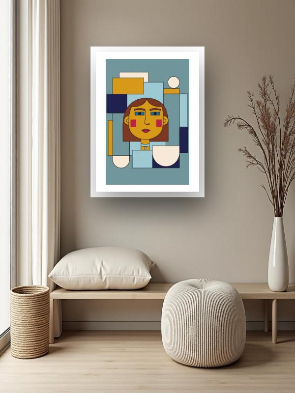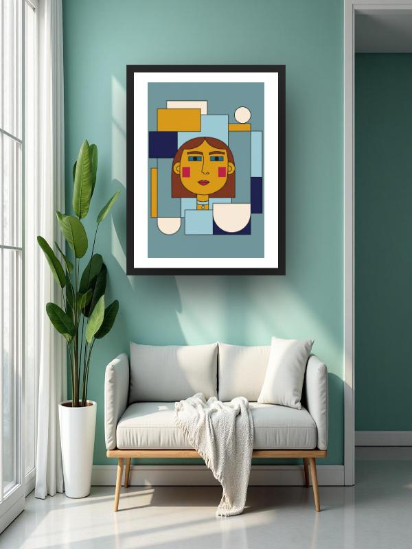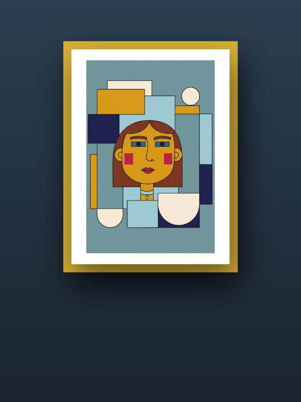 A woman's face cuts through a storm of sharp rectangles, her blue eyes and red cheeks blazing against a backdrop of mustard yellow, deep navy, and icy blue. The colors slam together, sending a jolt of energy through the calm teal that tries to hold them back. Her gaze grabs you and won’t let go, fierce and unblinking in the chaos. Warmth and chill collide here, leaving a charge in the air that sticks with you long after you look away.
