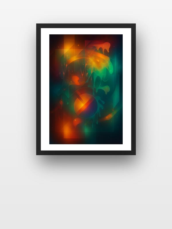 Liquid shapes explode and drip across a storm of teal, orange, and electric green, smashing into sharp rectangles and a glowing, split circle. Heat and coolness fight for space, the colors clashing and fusing in a restless, electric dance. Light burns at the center, shooting outward and setting the edges alive with movement and tension. The piece jolts your senses, leaving a raw charge that lingers long after you look away.
