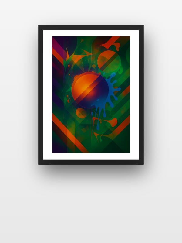 A blazing orange sphere explodes through a field of deep green, its edge crackling with electric blue. Sharp diagonal lines carve the space, slicing the calm with restless energy. The clash of fiery orange and cool green sends a jolt through your senses, stirring tension and excitement. This piece grabs you and won’t let go, pulsing with raw, unstoppable force.