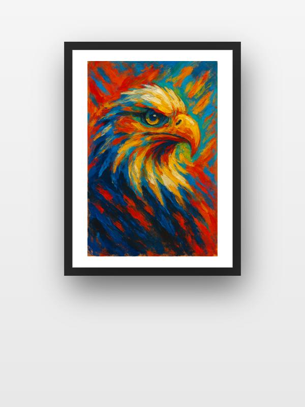 An eagle’s glare slices through a riot of electric blue, blazing orange, and molten gold. Its beak juts forward, sharp and unbreakable, while feathers crackle with wild, kinetic energy. Every brushstroke surges outward, flooding the canvas with raw movement and defiance. This painting hits you with a jolt of courage and fire, daring you to look away.