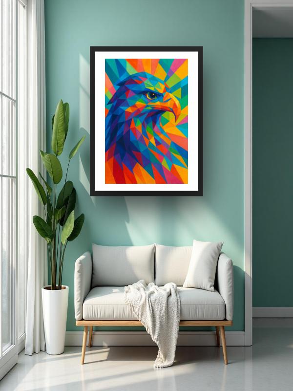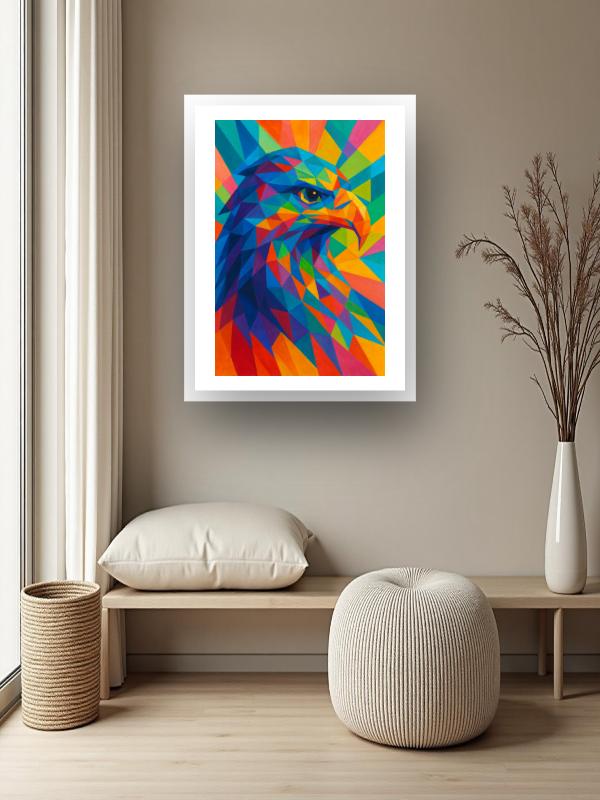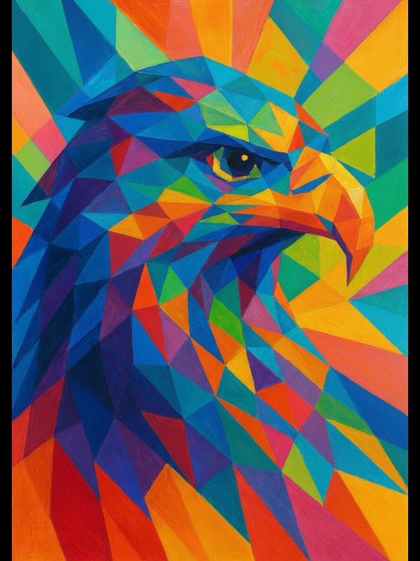 An eagle’s head explodes from a storm of jagged color, its stare razor-sharp and unyielding. Shards of electric blue, blazing orange, and toxic green crash together, crackling with raw energy. The beak cuts through the chaos like a blade, demanding your attention. These colors don’t whisper—they hit you hard, leaving your senses wide awake and your pulse racing.