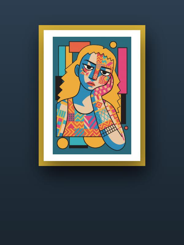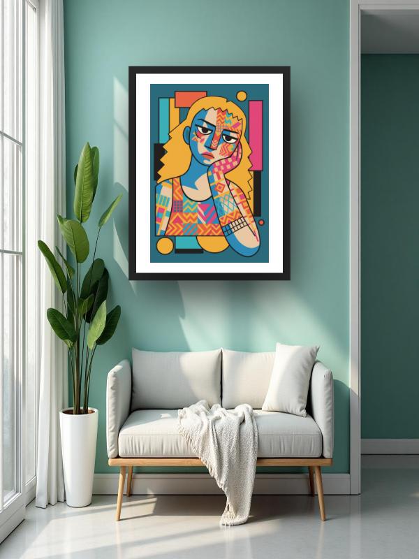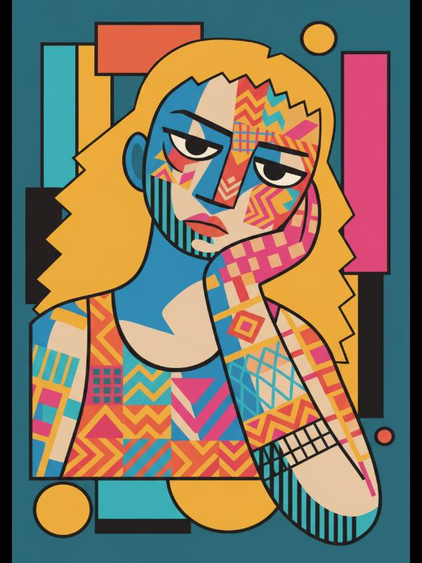 A woman slumps in boredom, her face and arm carved by jagged lines and restless patterns. Electric blue, hot pink, and jolts of yellow slice across her skin, turning her into a living patchwork. The colors buzz with wild energy, but her heavy eyes stay stubborn and distant. This portrait crackles with frustration, trapping a storm of feeling just beneath the surface.