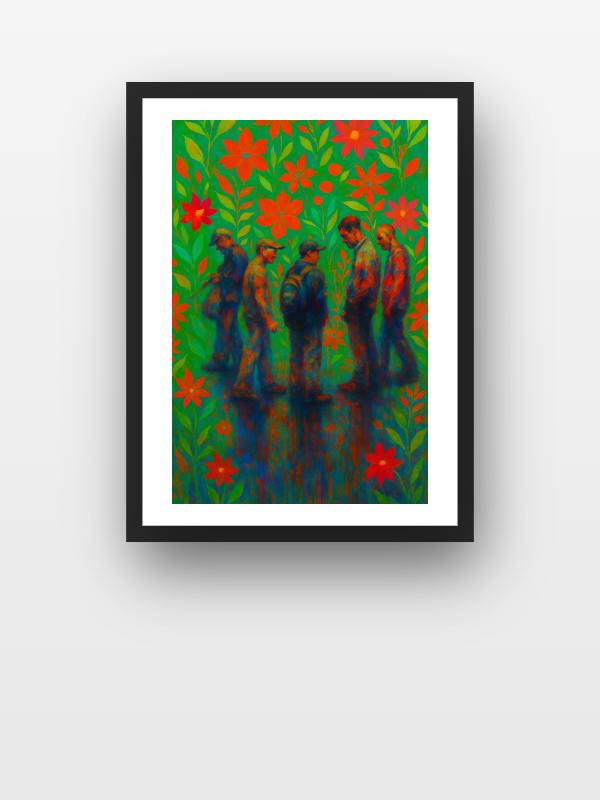 Five men stand in a loose circle, their bodies weighed down by shadow as wild red flowers and green leaves explode behind them. The clash of scarlet and emerald hits hard, making the figures feel both exposed and swallowed by the chaos. Each man’s stance hints at struggle and distance, their faces half-turned and wary. The colors burn with restless energy, leaving you unsettled and alert, as if the world behind them is fighting to break through.