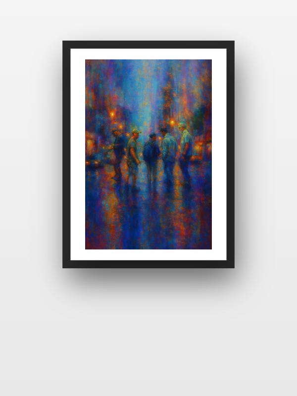 Six men huddle in a loose circle, their outlines smeared by the electric clash of city lights. Deep blue shadows and streaks of orange fire tear through the night, flooding the scene with restless energy. Reflections ripple across wet pavement, doubling the sense of movement and fleeting connection. The painting jolts you with the raw, uncertain charge of urban life—impossible to ignore, impossible to pin down.