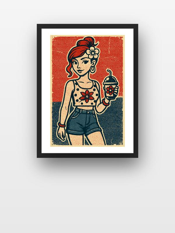 A fierce woman with blazing red hair stands tall, her eyes daring you to look away as she grips a flower-topped drink. Electric reds, deep blues, and creamy whites collide in the background, pulsing with retro pop attitude. Polka dots and bursts of flowers explode across the scene, turning up the heat and energy. The colors hit hard, leaving you charged and ready to take on anything.