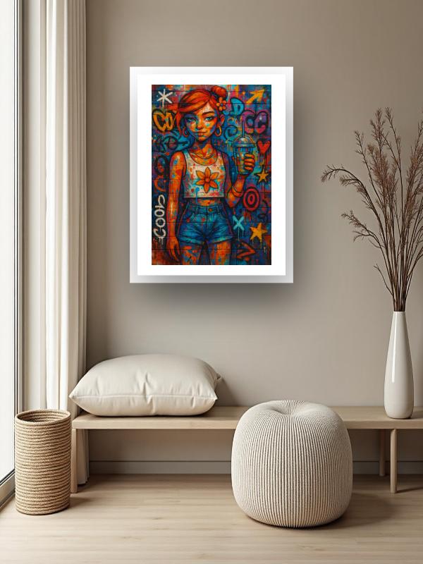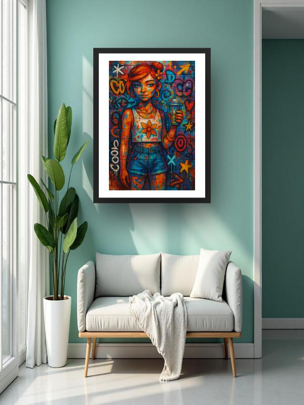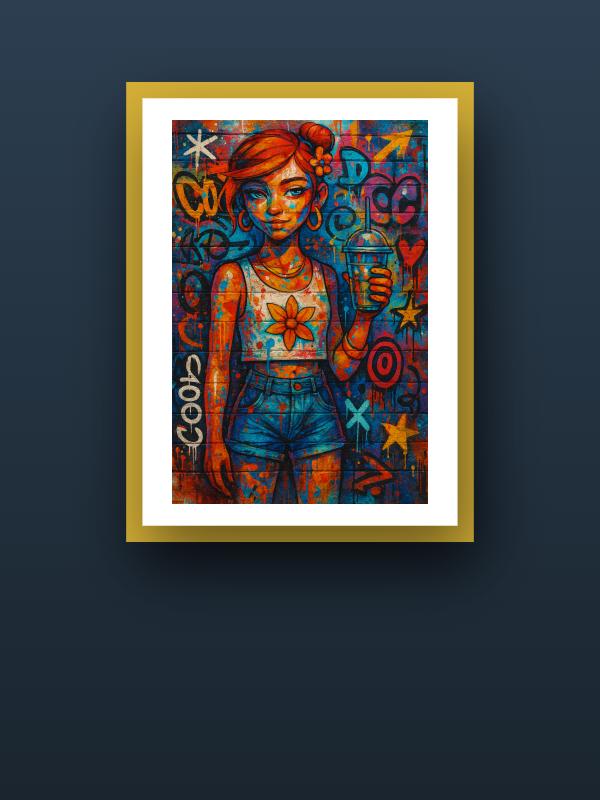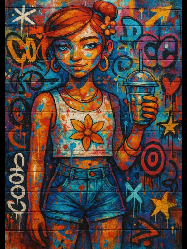 A girl with wild orange hair locks eyes with you, her grip on a cold drink daring anyone to challenge her. Electric blue and searing orange graffiti explode behind her, splashing across her skin and clothes with raw, restless energy. Her sunflower crop top and denim shorts blaze against the chaos, bold and unafraid. The colors hit hard—vivid, hot, and impossible to ignore—leaving you charged and wide awake.