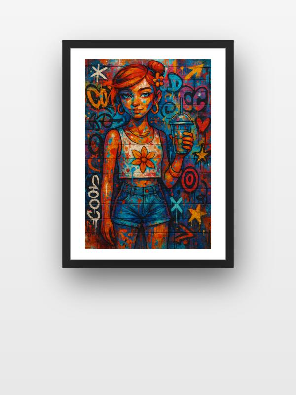 A girl with fierce orange hair and a sunflower tank top stares you down, gripping a cold drink with unbreakable confidence. Electric blues and fiery oranges explode across her skin and clothes, splattering the wall behind her with wild graffiti and bold shapes. Every color pulses with restless energy, turning the scene into a riot of heat and movement. The clash of hot and cool tones jolts your senses, leaving you charged and wide awake.