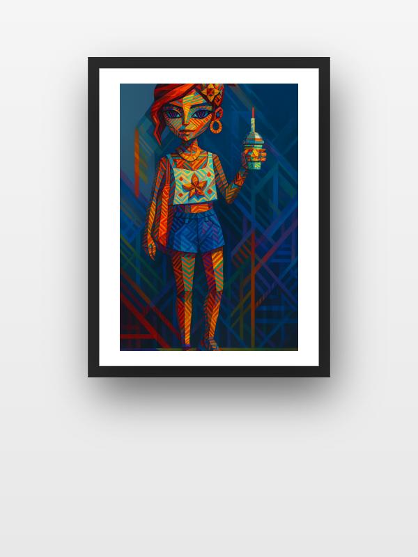 A girl stands unflinching, her body sliced by jagged stripes of orange, blue, and electric yellow that crackle with energy. Her eyes dare you to look away, fierce and alive, while a frozen drink clenched in her fist radiates cool defiance. The colors collide and pulse, throwing heat and chill in every direction, making the whole scene vibrate. This artwork hits you hard—bold, unapologetic, and impossible to ignore.