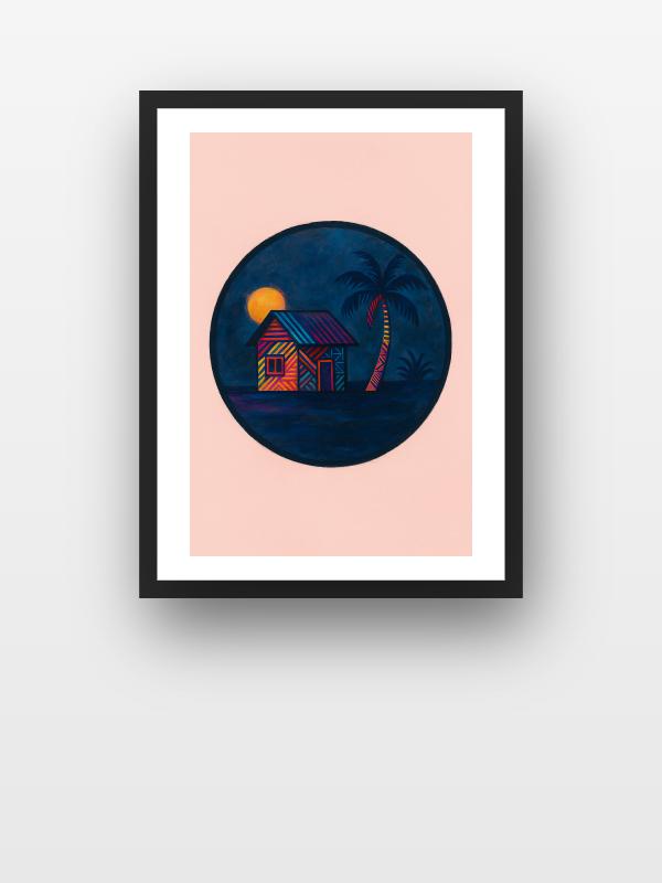 A lone hut blazes with neon stripes, slicing through the midnight blue like a signal in the dark. Electric pinks, oranges, and blues crash against each other, making the scene vibrate with restless energy. A palm tree, wrapped in bold color, leans in as if drawn to the heat. The heavy yellow moon hangs low, flooding everything with a fierce, watchful glow that dares you to step closer.