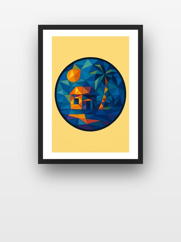 A blazing sun slices through a fractured sky, setting a small house and palm tree ablaze in shards of orange, yellow, and deep blue. The colors collide and vibrate, throwing heat and coolness across every jagged edge. Light ricochets from the glowing roof to the shadowed ground, making the whole scene crackle with restless energy. This piece jolts you with warmth and calm, like stepping into a memory that refuses to fade.