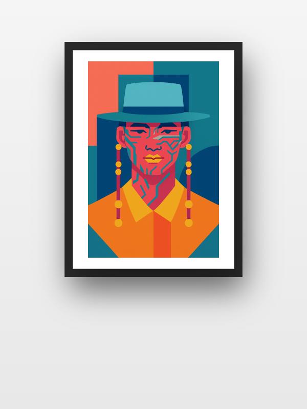 A sharp-faced figure locks eyes with you, their magenta skin slashed by electric blue lines that crackle with energy. A teal hat and golden earrings slice through the scene, radiating cool confidence against a backdrop of clashing orange and blue. The colors collide and spark, charging the portrait with restless heat and icy defiance. This image doesn’t ask for attention—it seizes it, pulsing with the force of someone who refuses to fade into the background.