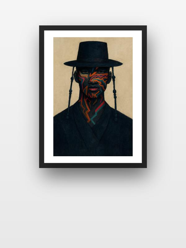 A figure glares straight ahead, face slashed with jagged streaks of electric orange, red, and teal that rip through the darkness of a black hat and robe. The neon colors crackle against deep shadows, charging the portrait with raw defiance and tension. Every line pulses with energy, refusing to fade into the muted background. The image hits hard—bold, unblinking, and impossible to ignore.